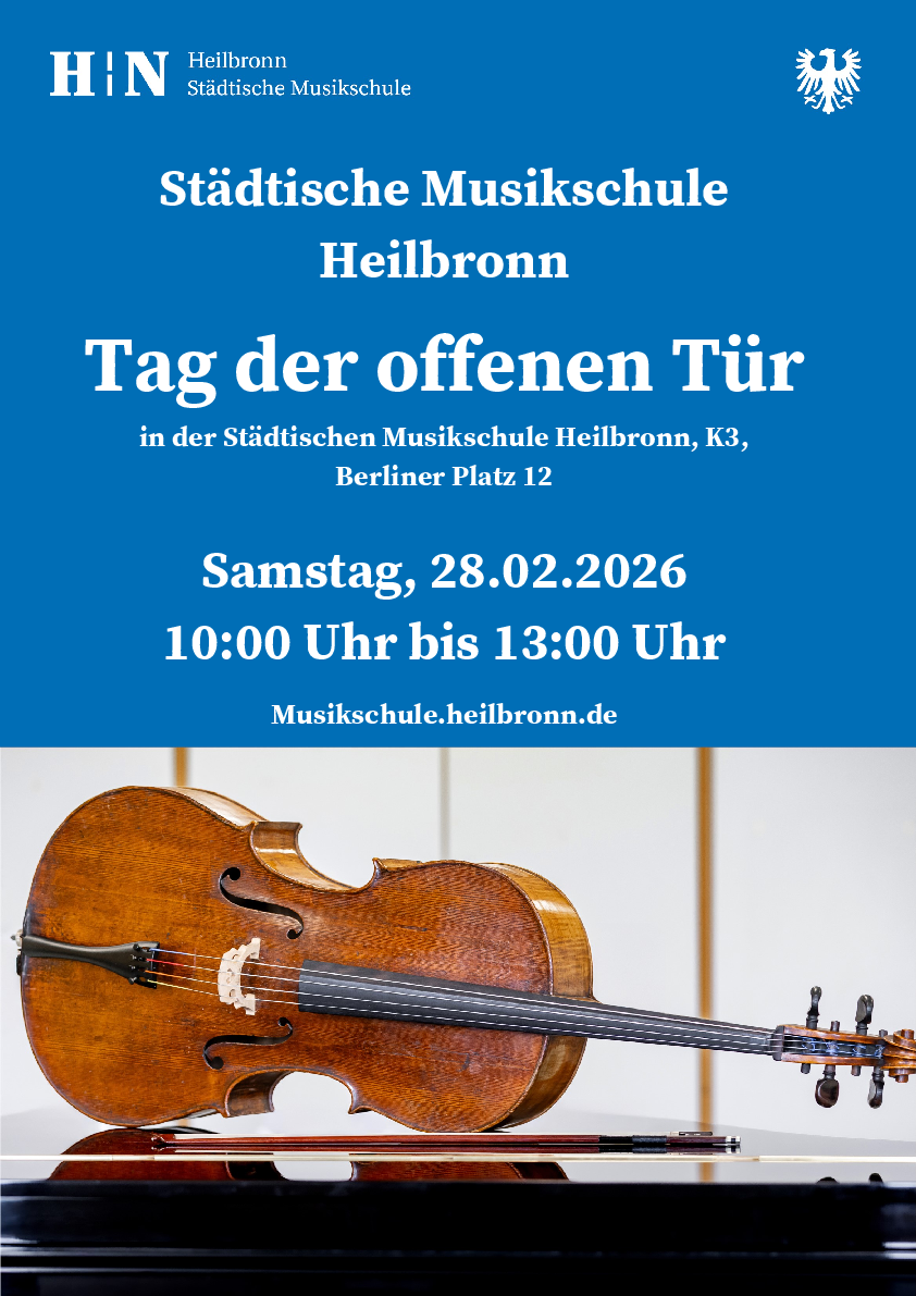 Dieser findet am Samstag, den 28.02.2026, von 10:00-13:00 Uhr in den Räumlichkeiten der Städtischen Musikschule Heilbronn im K3 statt.