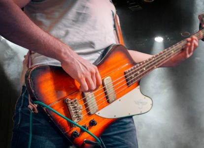 Anders als die akustische Gitarre besteht der Korpus der E-Gitarre meist aus massivem Holz. Der durch die Schwingung der Saiten erzeugte Ton wird über elektromagnetische Tonabnehmer verstärkt wiedergegeben. Da die akustische Gitarre zu leise für größere Musikgruppen ist, wurde nach einer Möglichkeit gesucht, die Lautstärke und das Klangvolumen zu erhöhen. Daraus resultierte die Idee und der Bau der E-Gitarre, die heute aus keiner Jazz-, Rock-, Popband mehr wegzudenken ist.